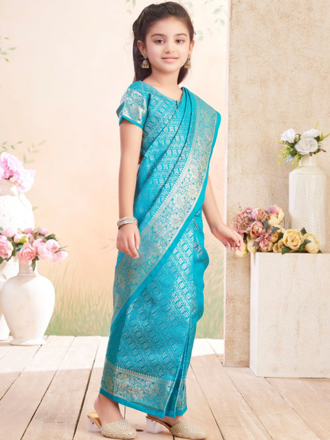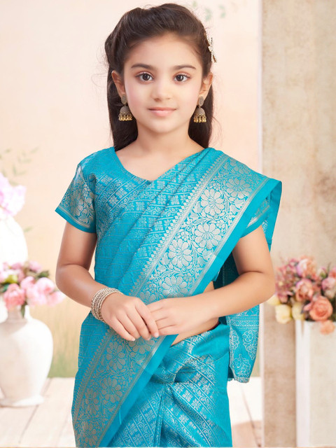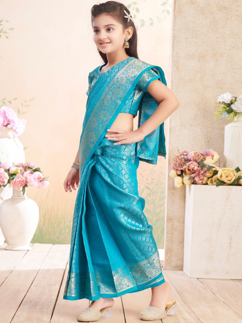 The model is wearing the stitched blouse that comes with the saree