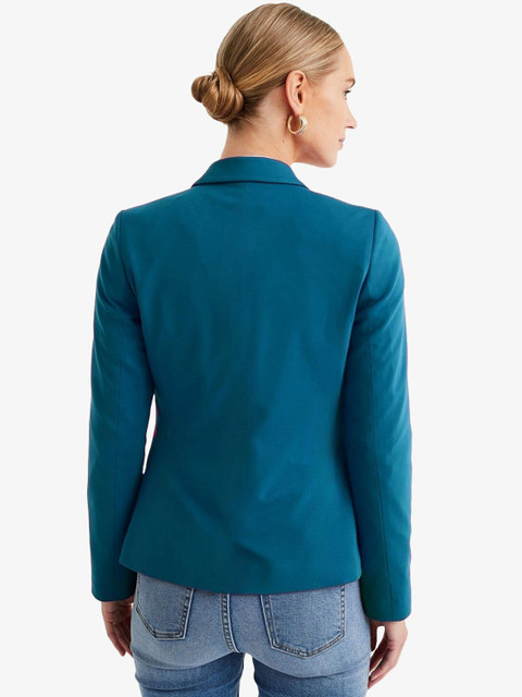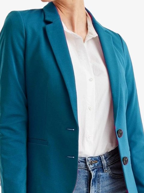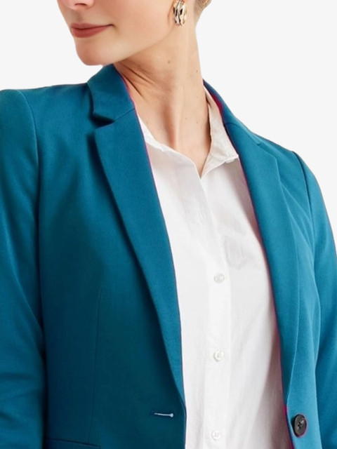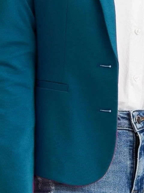 Teal blue solid regular-fit blazer, has a single-breasted with double button closure, notched lapel collar, button closure, long sleeves, two pockets & ventless