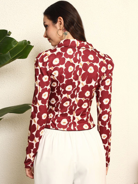 Maroon Printed slim-fit casual blazer, has a notched lapel, long sleeves, single-breasted with double button closure, two flap pockets, one welt pocket and a Single-vented back hem