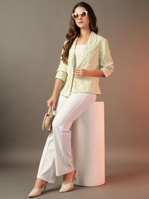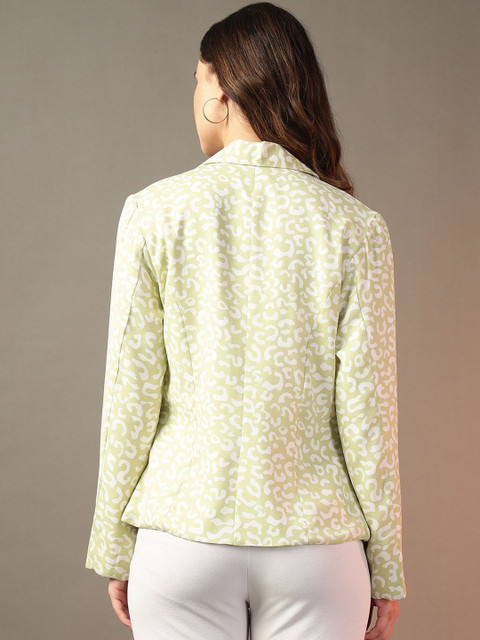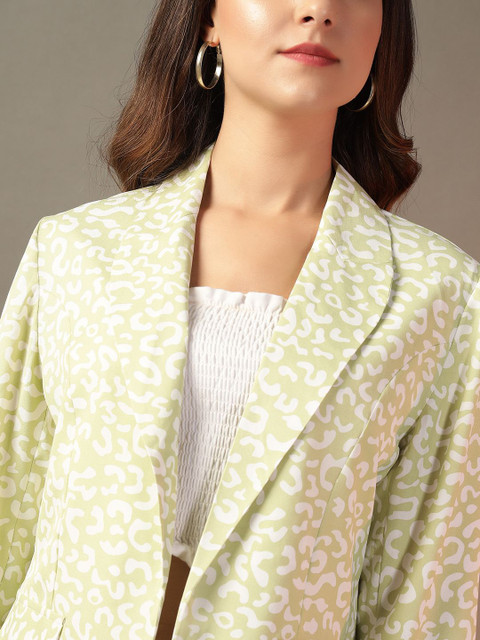 Green & White printed Regular-fit formal blazer, has a notched lapel, long sleeves, Open front, two pockets and a ventless back hem