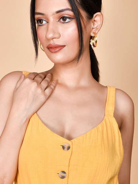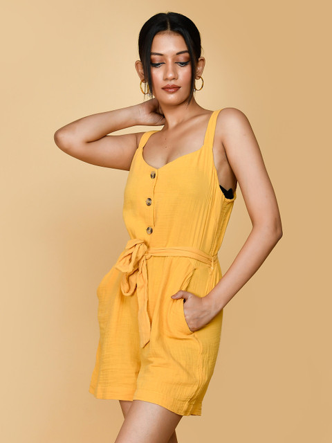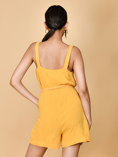 Yellow solid playsuit with waist tie-ups ,has a shoulder straps, sleeveless, 2 pockets