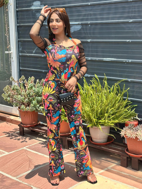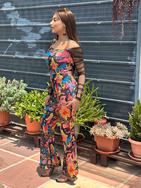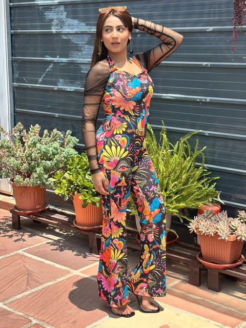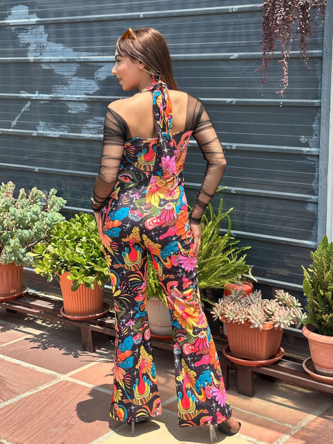 Black and pink printed basic jumpsuit ,has a halter neck, long sleeves.