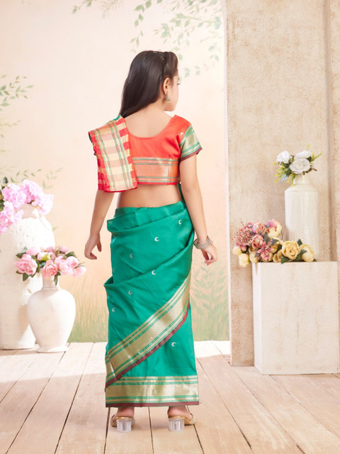 The model is wearing the stitched blouse that comes with the saree