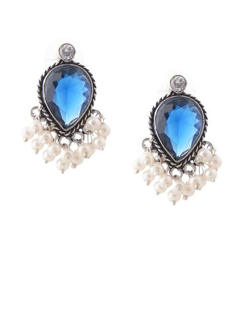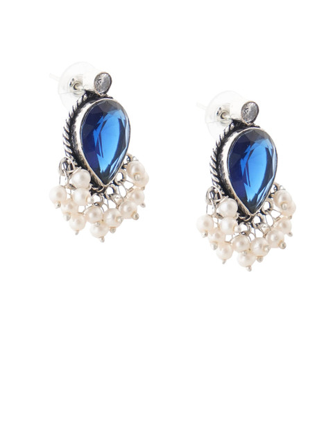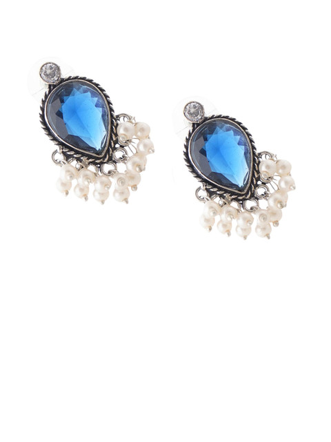Blue-coloured,white and silver oval shaped studs, has artificial stones studded and beaded details