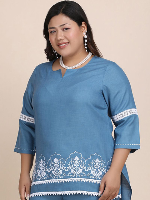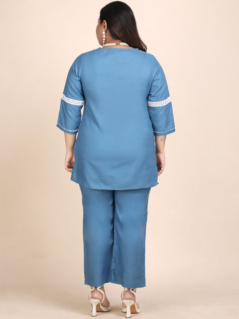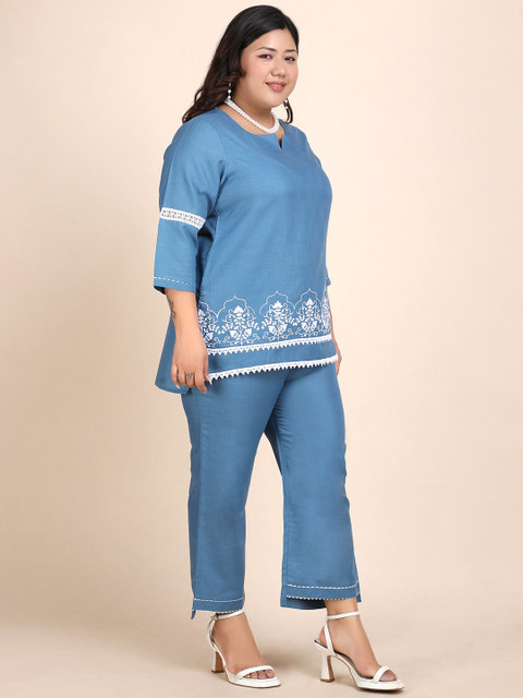 Bani Women Embroidered Plus Size Round Neck Casual Tunic With Trouser Co-Ords