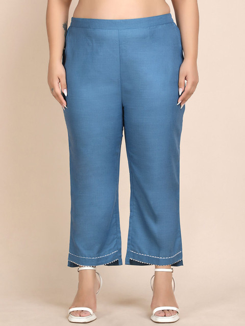 Blue solid trousers, has an elasticated waistband with slip on closure