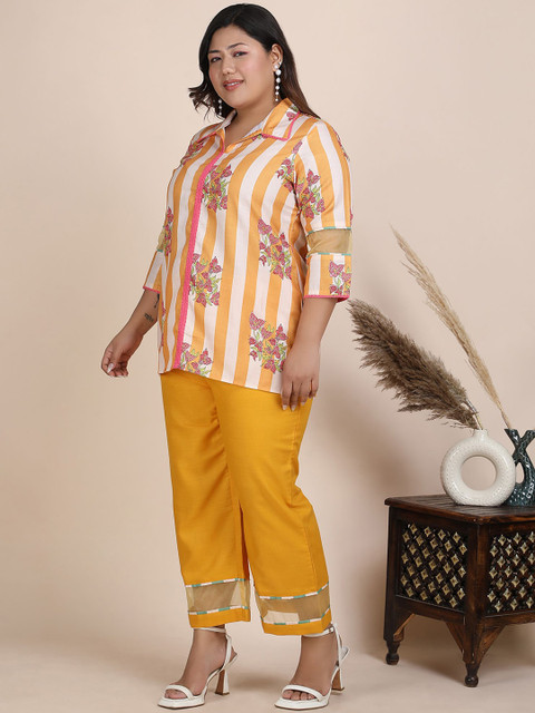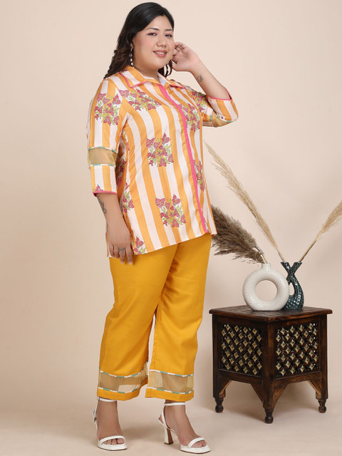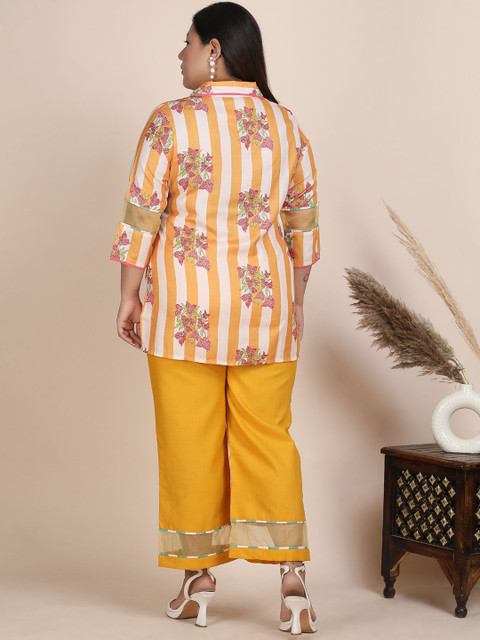 Mustard-Yellow printed tunic, has a shirt collar neck and three quarter sleeves, secured with slip on closure