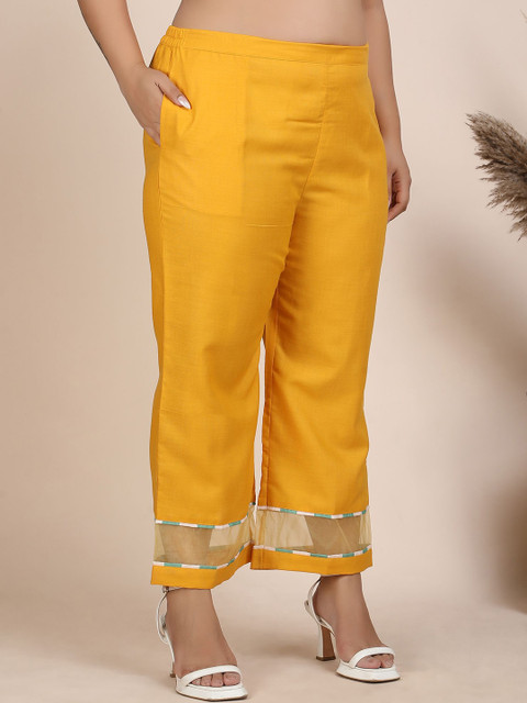 Mustard-Yellow printed trousers, has an elasticated waistband with slip on closure