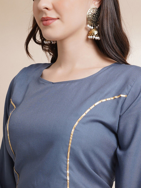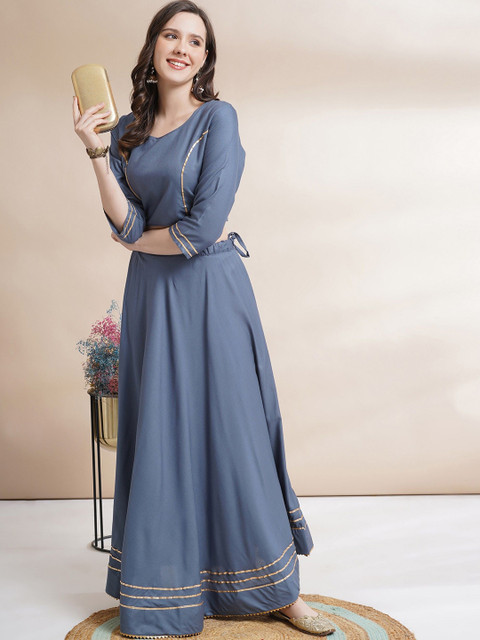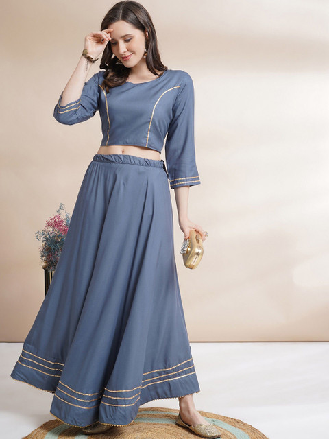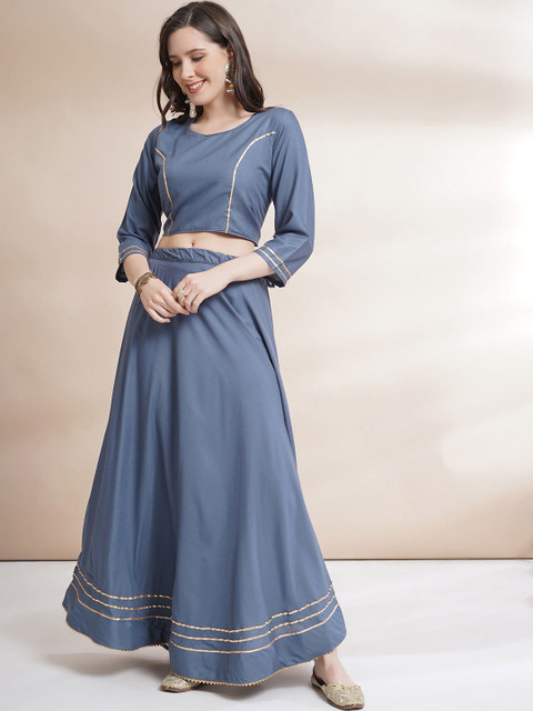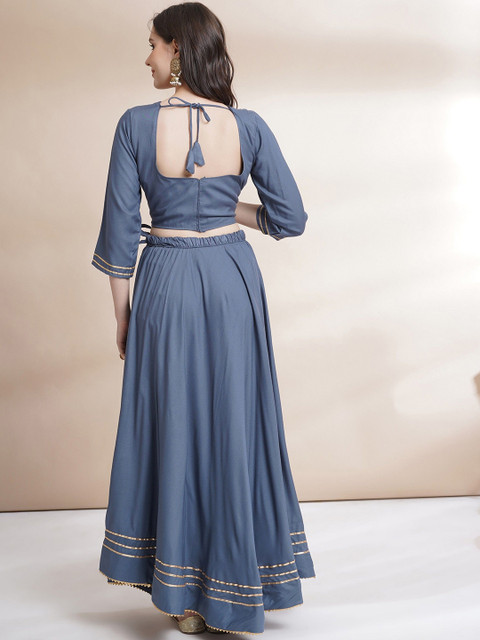 Grey and gold-toned solid ready to wear blouse, has a u-neck, three-quarter sleeves, grey and gold-toned solid ready to wear lehenga, flared hem