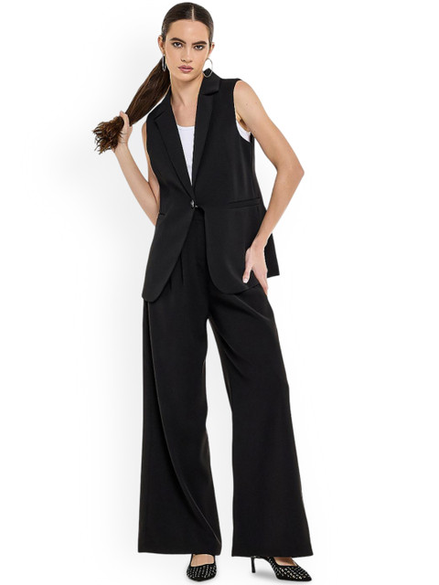 Black solid comfort-fit formal blazer, has a notched lapel, sleeveless, single-breasted with single button closure, two flap pockets and a ventless back hem