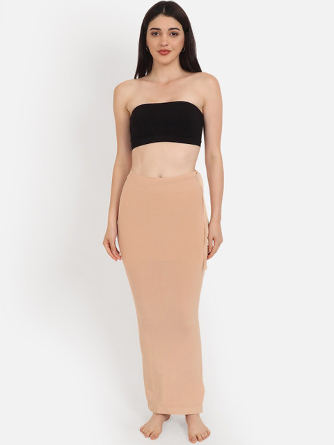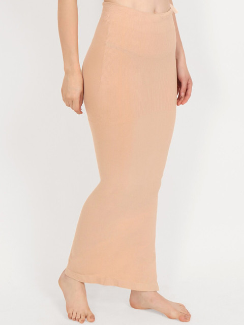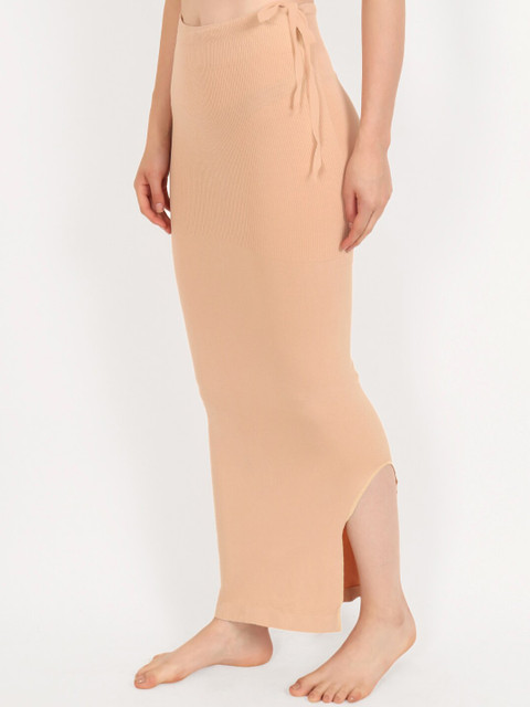 Beige ribbed saree shapewear, has an elasticated waistband with drawstring closure, a slit and straight hem