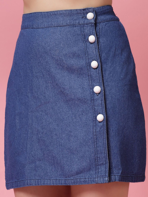 Blue solid mini A-Line skirt, has an elasticated waistband with button closure, and a straight hem