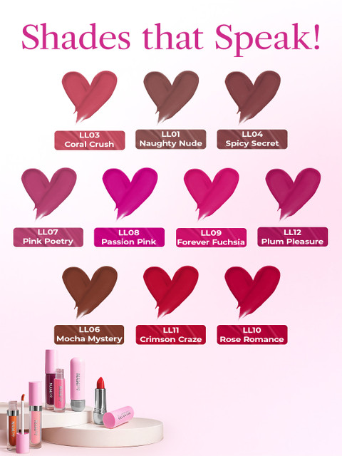 | Ingredients | Key Ingredients:Hyaluronic Acid: Delivers instant and long-lasting hydration by attracting moisture deep into the lips. Keeps them plump, supple, and never dry.Sweet Almond Oil: Rich in vitamins and fatty acids, it nourishes and softens lips while helping to restore natural moisture balance.Jojoba Oil: Mimics skin's natural oils to condition and soothe. Prevents flakiness and keeps lips calm, smooth, and comfortable.Raspberry Extract: Packed with antioxidants, it helps protect lips from environmental stress while adding a subtle glow and freshness.Vitamin E: A powerful antioxidant that supports skin barrier health. Helps repair and protect lips, keeping them soft and resilient.Passion Fruit Extract: Loaded with vitamins A and C, it revitalizes and energizes lips while offering a burst of natural nourishment and shine.Full Ingredient List- Isododecane, Polybutene, Trimethylsiloxysilicate,Stearalkonium Bentonite, Propylene Carbonate, Trisiloxane, Glyceryl Behenate/Eicosadioate,Silica Dimethyl Silylate, Dimethicone, Diisostearyl Malate, Ozokerite,Hydrogenated Vegetable Oil,Stearyl Stearate,Stearic Acid, Hyaluronic Acid, Glycine Soja (Soyabean) Oil, Helianthus Annuus (Sunflower) Seed Oil, Brassica Campestris Seed (Rapeseed) Oil, Olea Europaea (Olive) Fruit Oil, Prunus Amygdalus Dulcis (Sweet Almond) Oil, Simmondsia Chinensis (Jojoba) Seed Oil, Sesamum Indicum (Sesame) Seed Oil, Phyllanthus Emblica (Amla) Fruit Extract, Tocopherol, Hydrogenated Polycyclopentadiene,Rubus Idaeus (Raspberry) Seed Oil, Tocopheryl Acetate (Vitamin E), Passiflora Edulis (Passion Fruit) Seed Oil,Pentaerythrityl Tetra-di-t-butyl Hydroxyhydrocinnamate, Aluminium Hydroxide, CI 77019, CI 15850:1, CI 77499, CI 19140, CI 77491,CI 77891, CI 77492, CI 15850, CI 77718, CI 45410:2,Parfum |