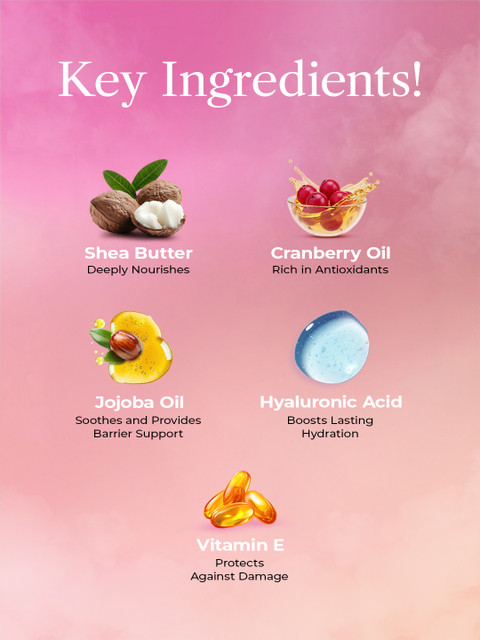| Ingredients | Shea Butter: Deeply nourishes and softens lips. Helps lock in moisture and smooth out texture for a plush, pillowy feel.Hyaluronic Acid: Delivers long-lasting hydration by attracting and retaining moisture. Keeps lips plump, supple, and never dry.Cranberry Oil: Rich in antioxidants and essential fatty acids. Helps protect lips from environmental stress while adding a natural glow.Jojoba Oil: Mimics skin's natural oils to condition and soothe. Prevents flakiness and keeps lips feeling balanced and calm.Vitamin E: A powerful antioxidant that helps repair and protect. Supports skin barrier health and keeps lips soft and resilient.Full Ingredient List- Hydrogenated Polyisobutene  , Isopropyl Myristate  , Candelilla Wax  , Carnauba Wax  , Ozokerite Wax  , White Bees Wax (synthetic)  , Synthetic Wax  , Phenyl Trimethicone  , Performacol 425  , Shea Butter  , Isodecyl Neopentanoate  , Octyl Palmitate  , Tri-isostearoyl Polyglycerol-3DimerDilinoleate  , Octyl Methoxy Cinnamate  , Caprylic/Capric Triglyceride  , Jojoba Oil  , Phenoxyethanol (and) Ethylhexylglycerin  , Cranberry Oil  , Hyaluronic Acid  , Tocopheryl Acetate  , Butylated Hydroxytoluene  , Isononyl Isononanoate  , Perfume  , Pearls &, Approved Colours  , Lake of FD &, C Yellow 5 C.I. No. 19140:1  , D &, C Red 6 C.I. No. 15850:2  , C Red 7 C.I. No. 15850:1  , Lake of D &, C Red 27 C.I. No. 45410:2  , Titanium Dioxide C.I. No. 77891  , Iron Oxide Red C.I. No. 77491  , Iron Oxide Yellow C.I. No. 77492  , Iron Oxide Black C.I. No. 77499  , Deep Maroon C.I. No. 15880:1  , Lake Of FD &, C Blue 1 C.I. No. 42090:1 |