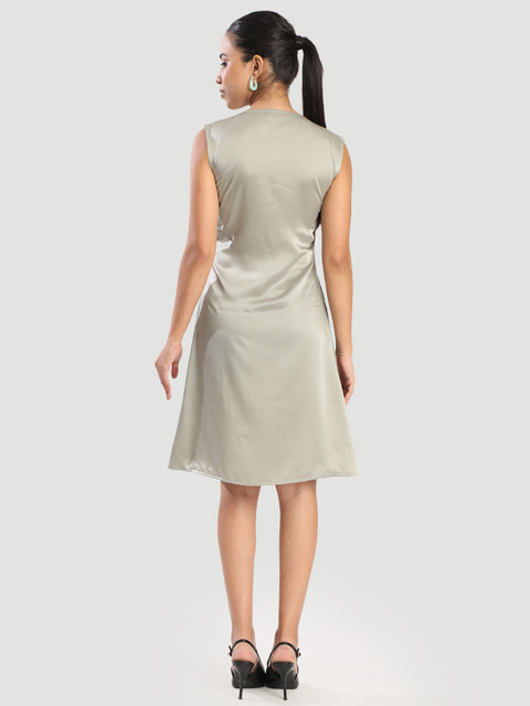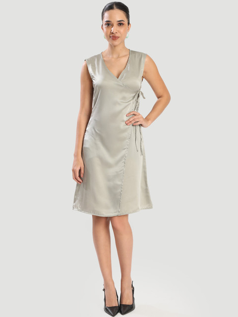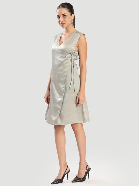 This mint satin midi dress showcases a sleek A-line silhouette with a tie-up detail and V-neckline. Perfect for party wear, its smooth polyester fabric ensures a sophisticated and comfortable look.