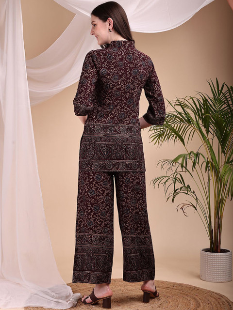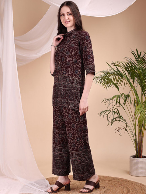 Maroon, beige and blue printed palazzo, has an elasticated waistband with slip-on closure has 2 pockets