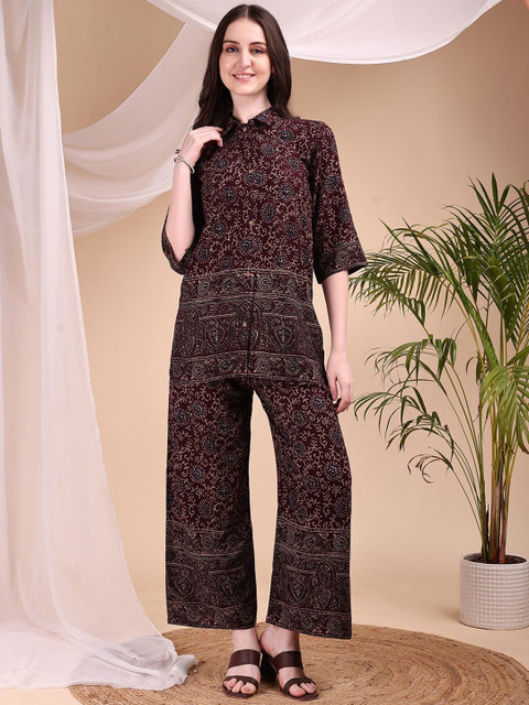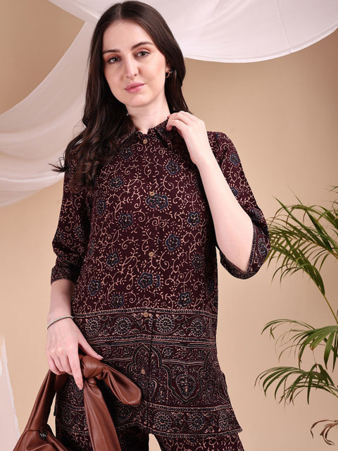 Maroon, beige and blue printed shirt, has a shirt collar neck and three quarter sleeves, secured with button closure