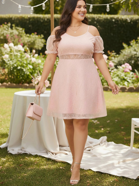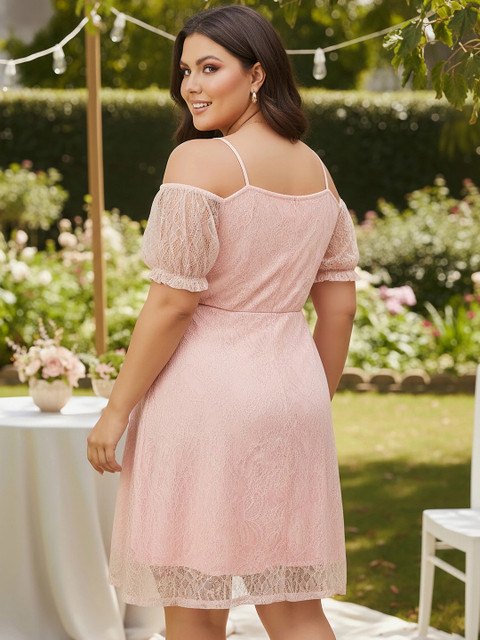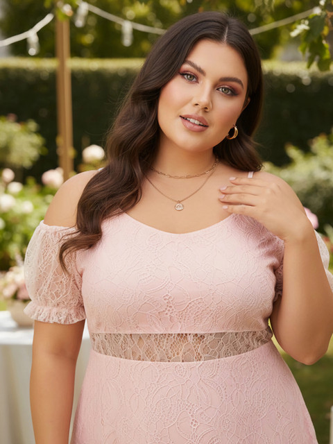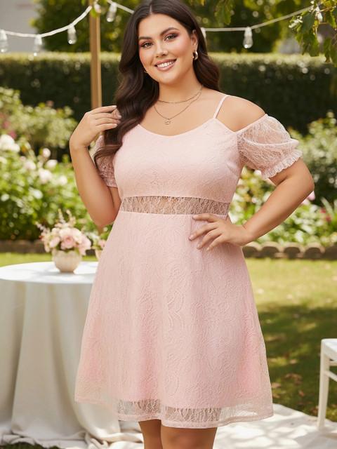This soft blush pink dress is a beautiful blend of elegance and femininity. Made of delicate lace fabric, it features sheer puff sleeves that add a dreamy and romantic touch. The dress has a cold-shoulder design with double straps for added detail, and a sheer lace waistband that breaks the silhouette stylishly while still keeping it graceful. The hemline is finished with a lace trim, adding to the overall charm. Paired with matching pink wedge sandals and bold pearl jewelry, the look is both chic and confident perfect for a fashionable day.