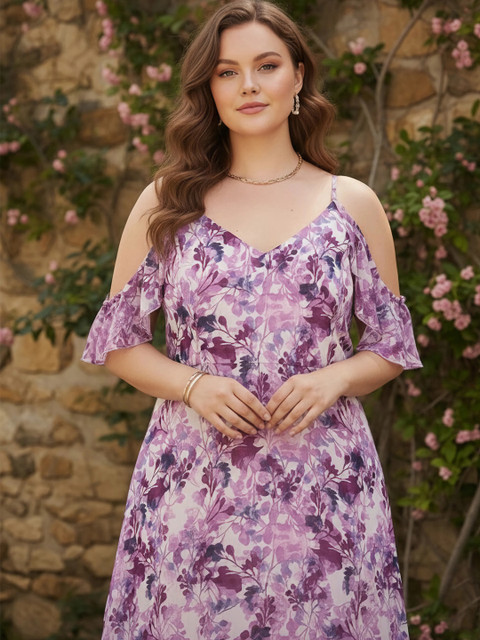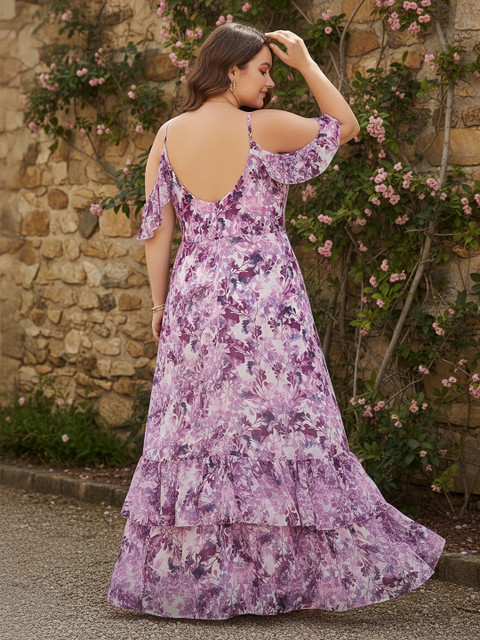 Berrylush Curve Plus Size White & Purple Floral Printed Layered Maxi Dress
