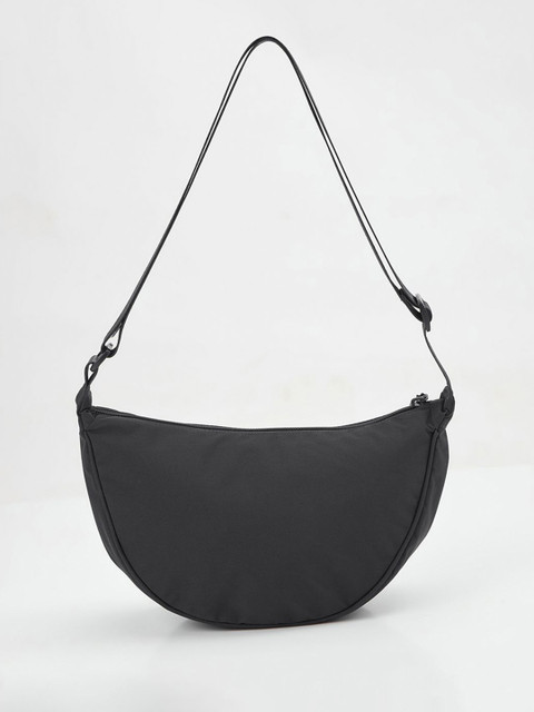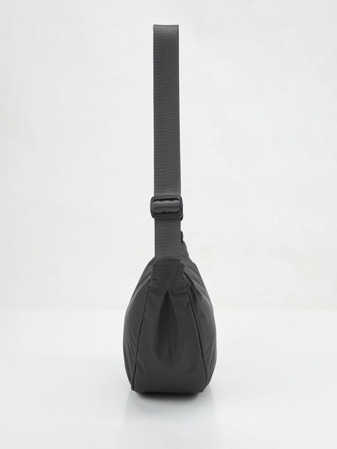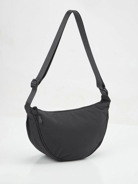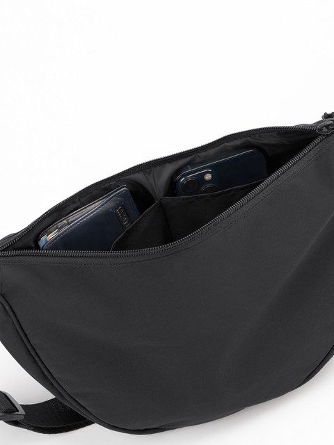 Black solid sling bag 1 main compartment, has a zip closure, na external pockets, 2 inner pockets