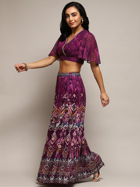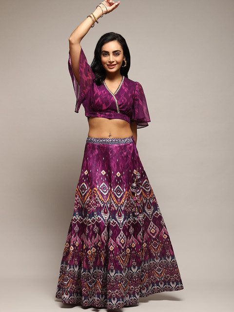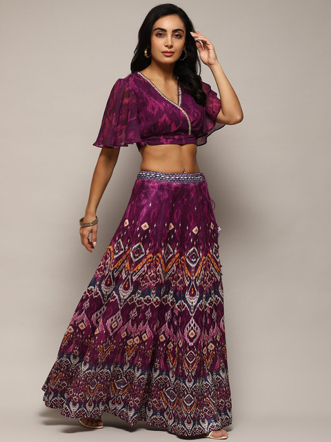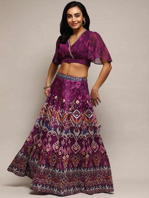 Pink and purple embellished ready to wear lehenga, has drawstring closure, flared hem