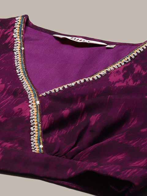 Pink and purple printed ready to wear blouse, has a v-neck, short sleeves, zip closure