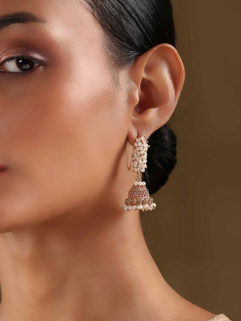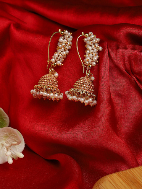Gold-toned dome shaped jhumkas, gold-plated, has artificial stones and beads