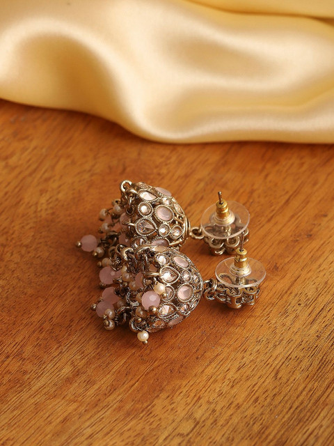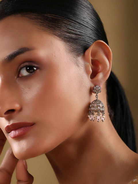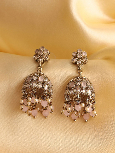 Silver-toned dome shaped jhumkas, gold-plated, has artificial stones and beads