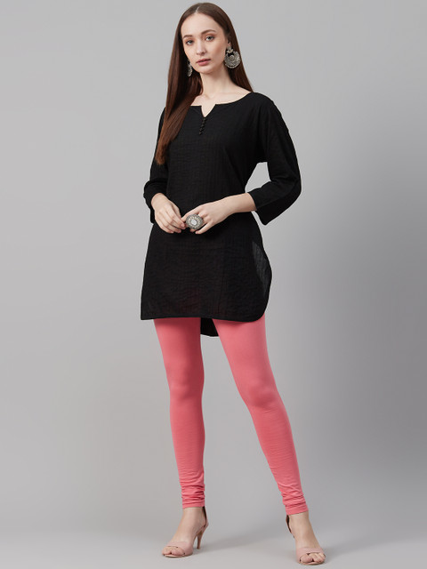 Tailored in a solid design, this pair of leggings is complemented with an elasticated waistband. An ideal pick, this one blends well with a solid kurta and flats.