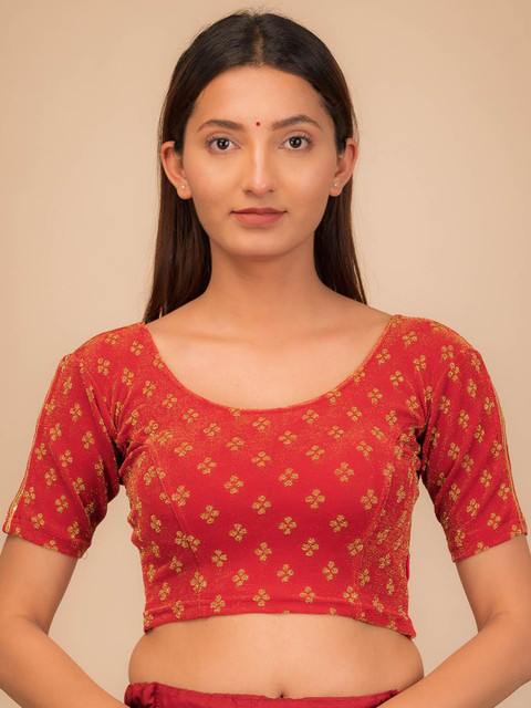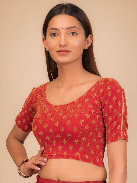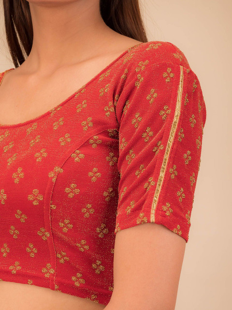 Red & Beige zari embellished stretchable saree blouse has a round-Neck, 3/4 regular sleeves, gota strip detailing at sleeves and back and slip-on closure, straight waist hem