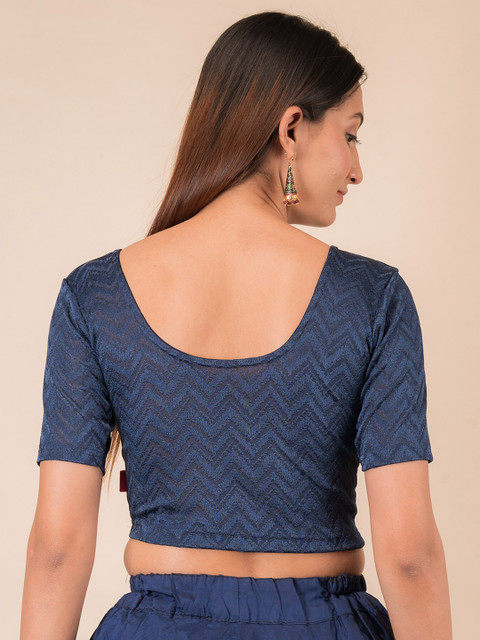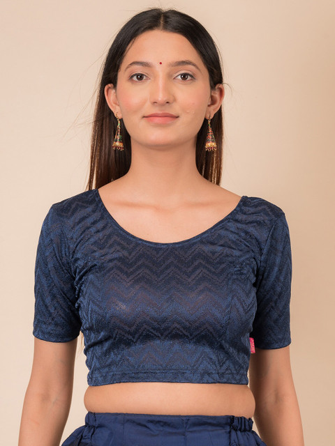 Navy blue zig zag woven design princess cut stretchable saree blouse has a round neck, short sleeves & slip on closure