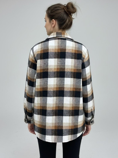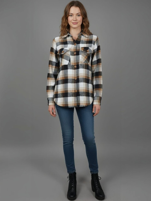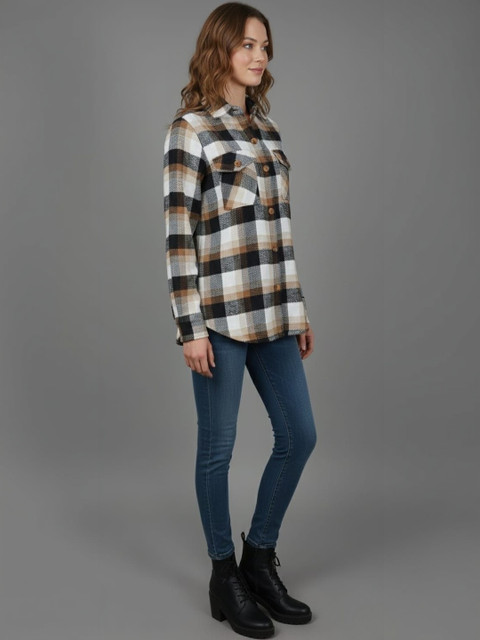 Multicoloured checked woven with utility pockets, has a spread collar, 2 pockets ,has a button closure, long sleeves, curved hemline, without lining
