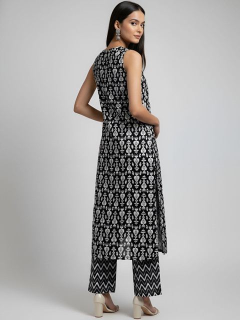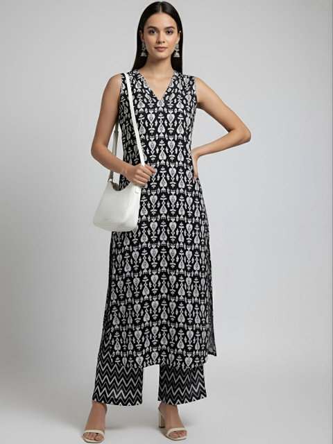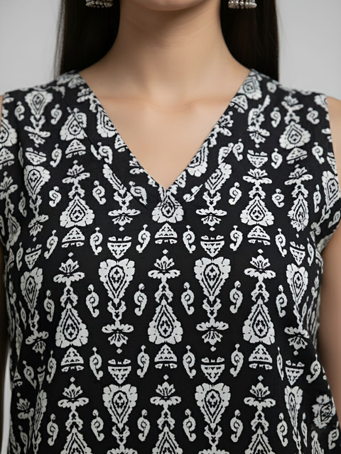 Black printed tunic, has a v neck and sleeveless, secured with slip on closure