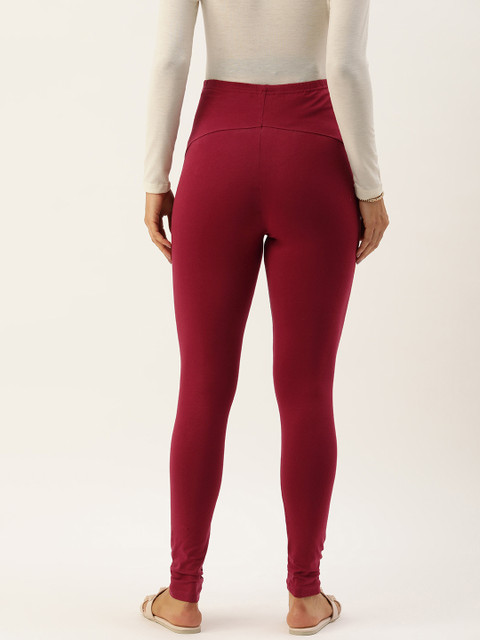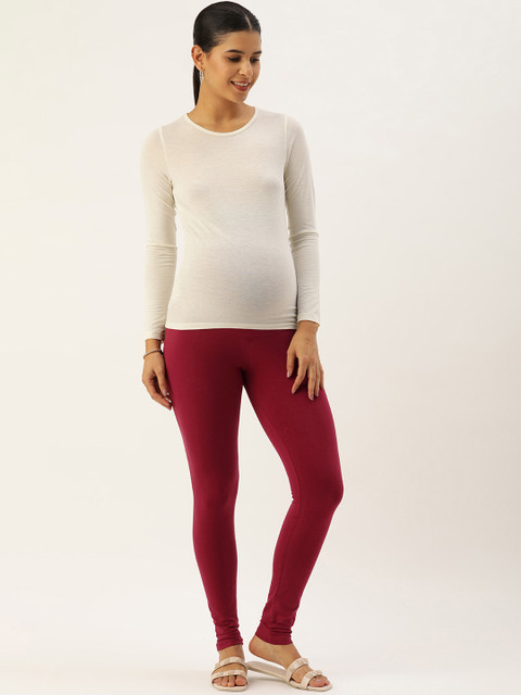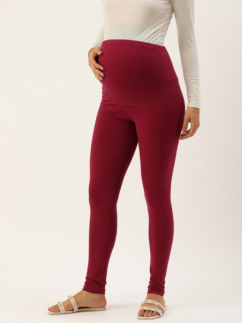 Maroon Over the Bump Solid Maternity Leggings, has slip-on closure