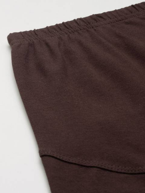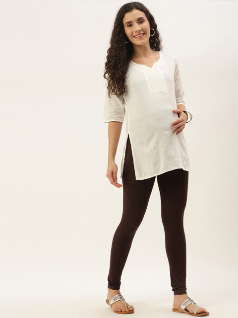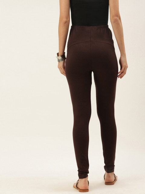 Coffee brown maternity churidar leggings, has an elasticated waistband, over bump style designed to fit through all stages of pregnancy