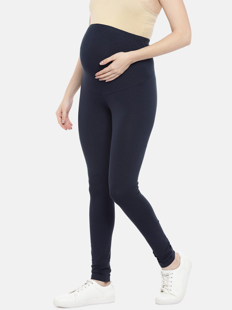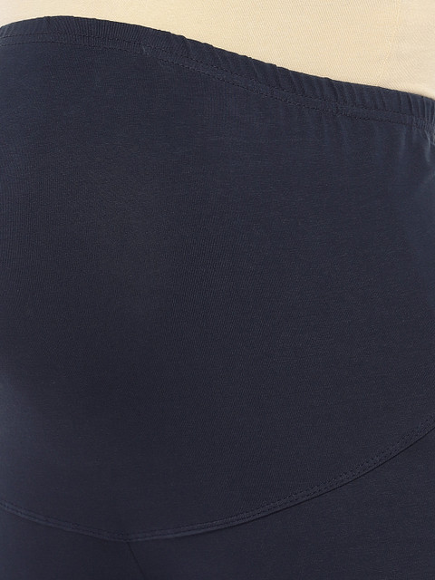 Navy blue solid maternity leggings, has ankle-length, elasticated waistband with slip-on closure