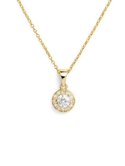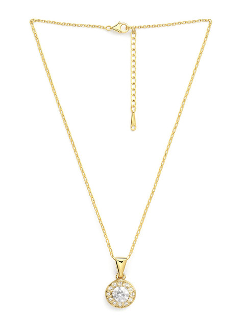 Gold toned and white circular shaped pendant with chain, has american diamond studded details