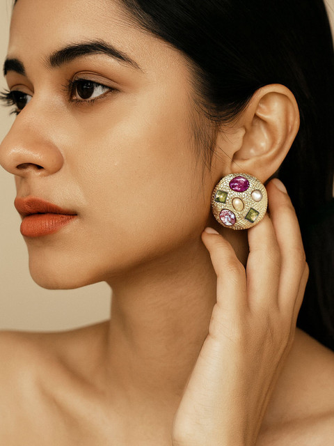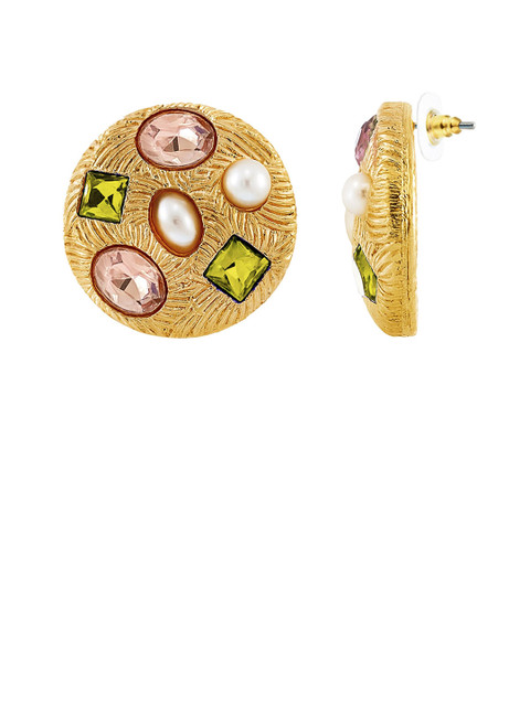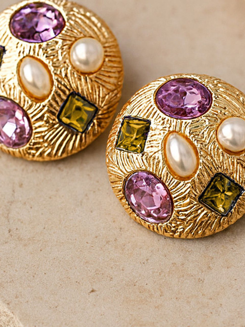 Gold-toned, purple and white circular shaped, has rhinestone studded details