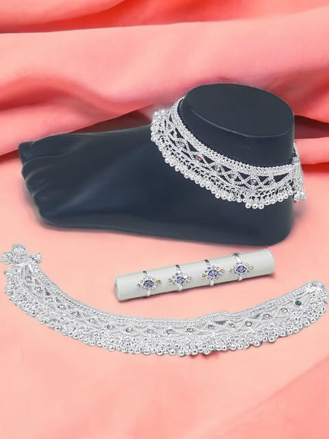 Silver-toned, red and green anklets, silver-plated, has artificial stones studded details