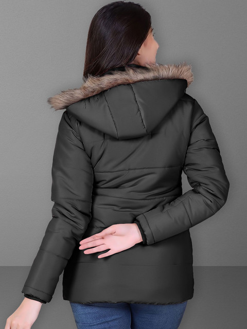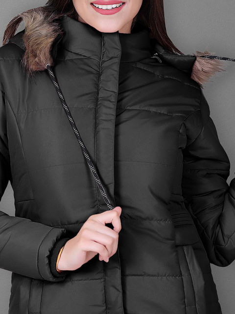Black floral solid lightweight parka with faux fur trim, has a hooded, 2 pockets ,has a zip closure, long sleeves, straight hemline, faux fur lining