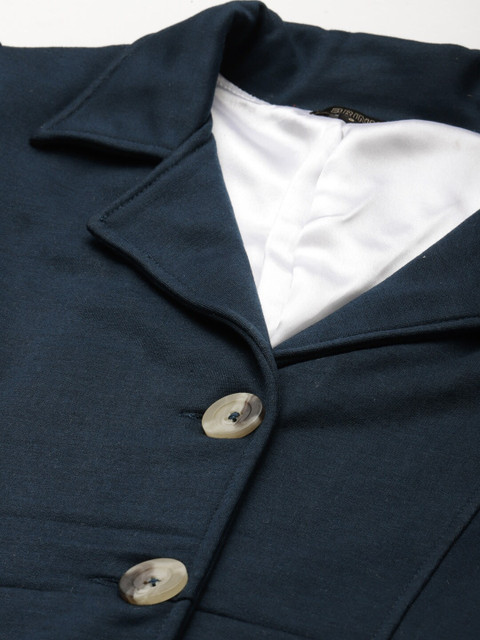 Teal-blue solid single-breasted overcoat, has Notched Lapel, long sleeves, button closure, two pockets, a straight hem
