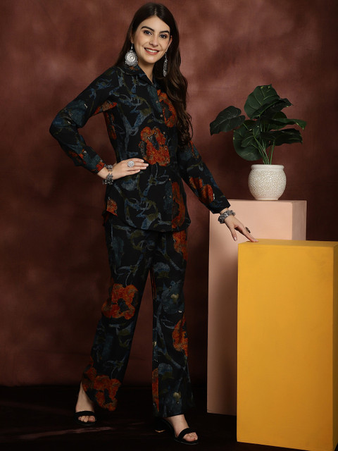 Buy Claura Navy Blue Printed Shirt With Trousers – – Apparel for Women