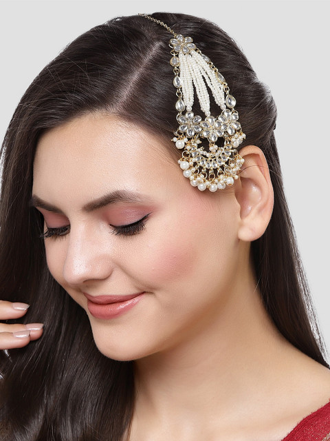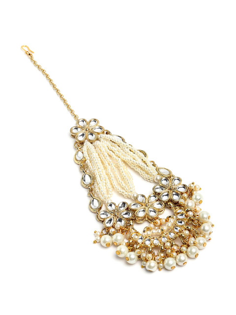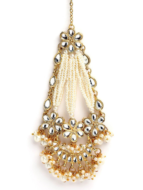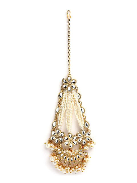 Gold-plated white kundan-studded beaded passa, has beaded droplets, secured with a fish hook