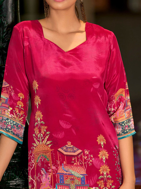 Pink, yellow and teal blue printed tunic, has a sweetheart neck and three quarter sleeves, secured with slip on closure