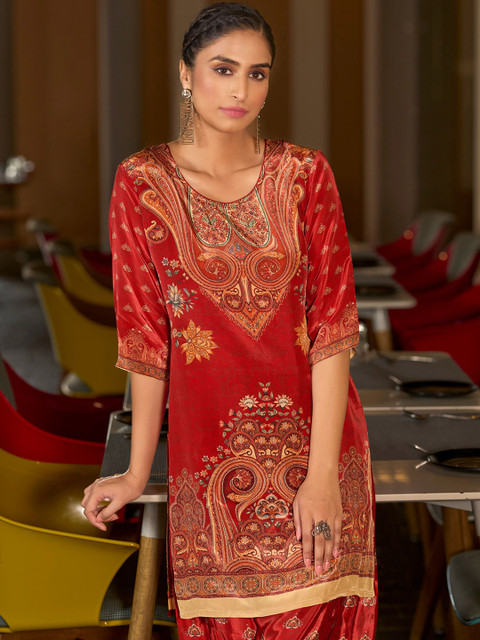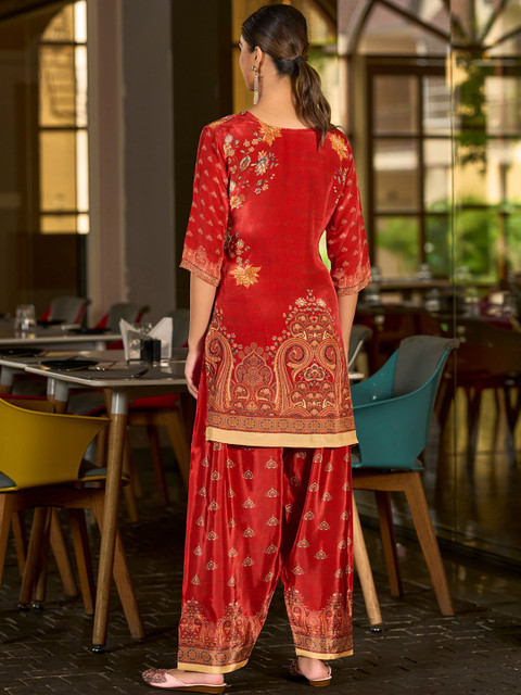 Red, beige and grey printed tunic, has a round neck and three quarter sleeves