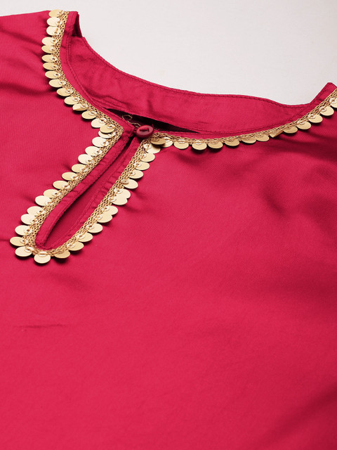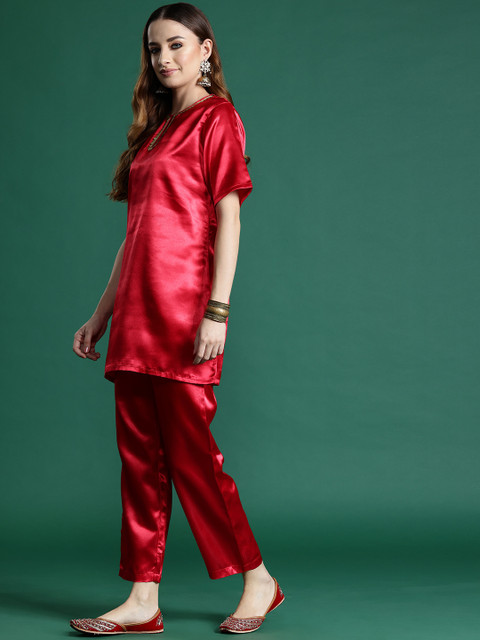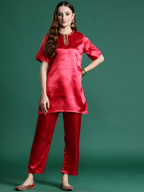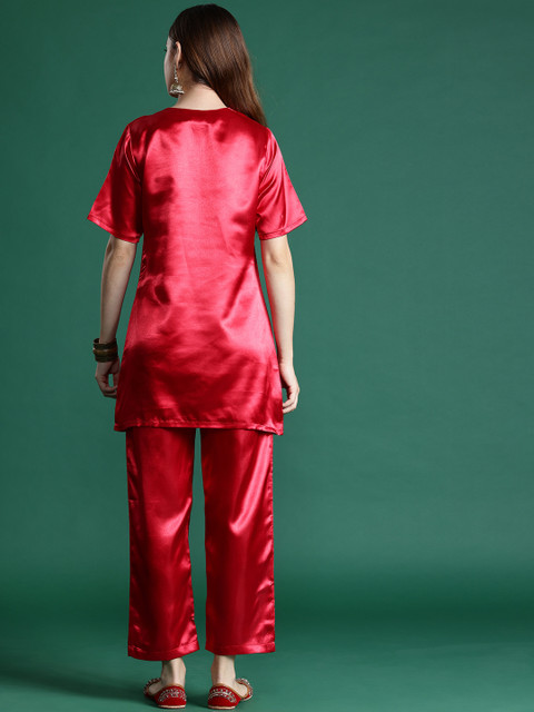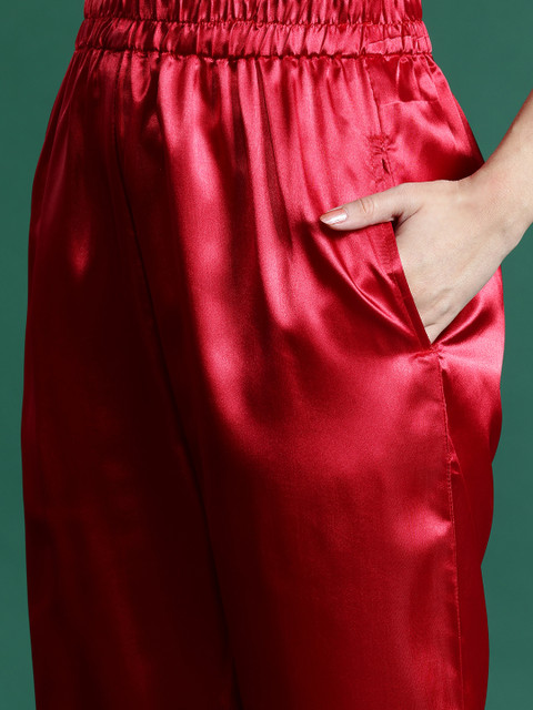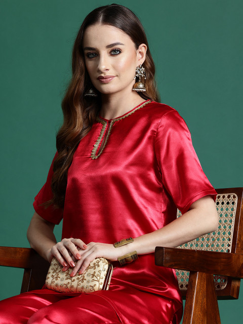 This classy satin finish co-ord is sure to help you flaunt your edgy aesthetic. With an elegant key-hole round neck, short regular sleeves, sequin detailing, and striking comfy trousers, this Sangria co-ord set is one you’ll be eager to show off at functions, or anywhere else your heart desires.