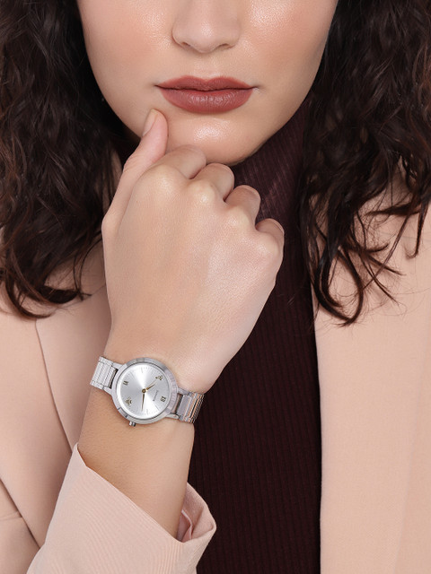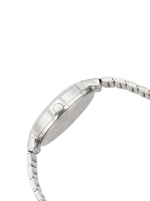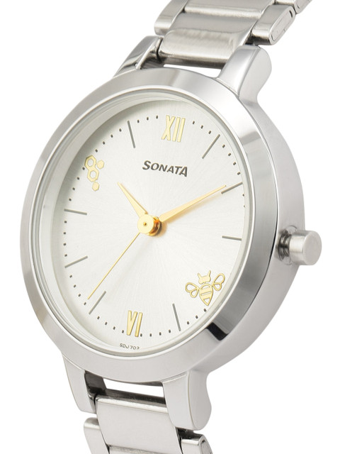 A combination of stately elegance and quirky fun, this accessory is just like the woman for whom it was made. The stainless steel craftsmanship and silver-toned surface lend this watch a contemporary brilliance, while the golden honey bee and beehive pattern give it a dash of playfulness. The combination of Roman and baton indices further emphasize the fusion between class and style.