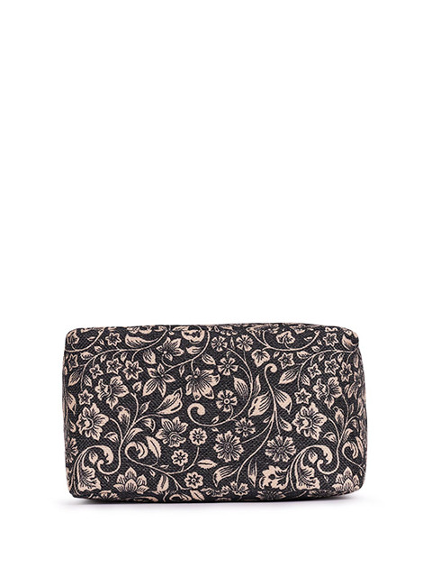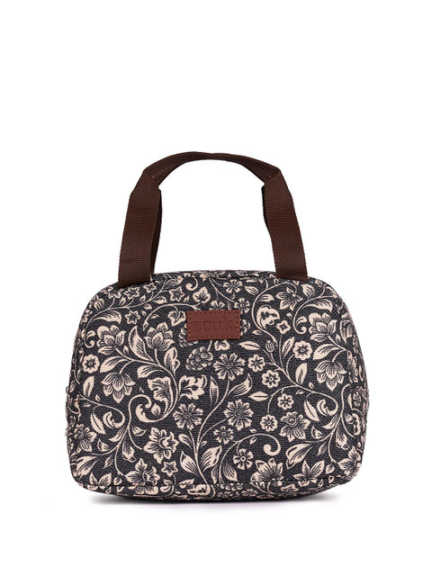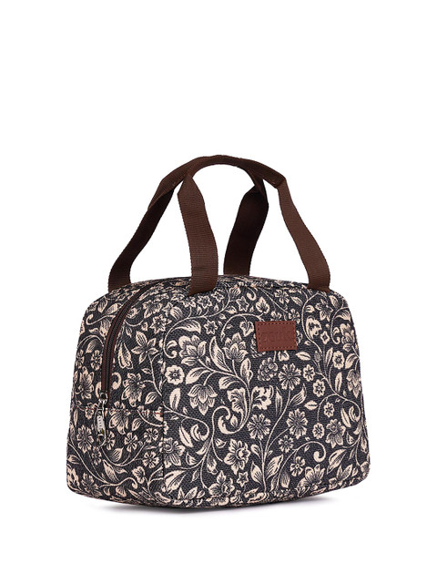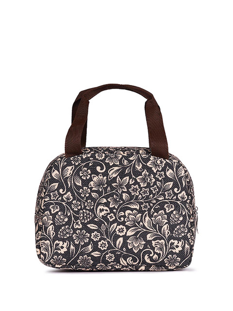 Black printed travel lunch bag, has a zipper closure