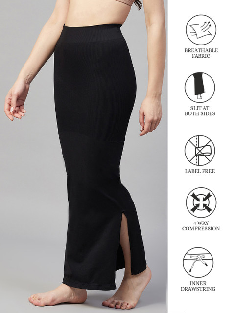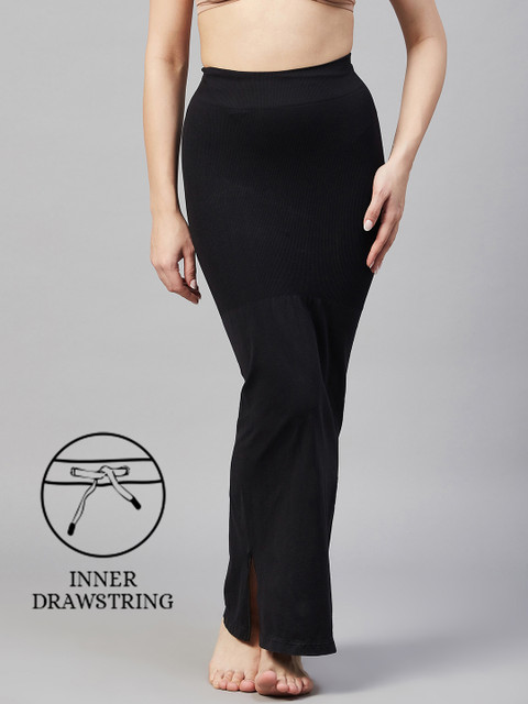 Black solid Seamless saree shapewear, has an elasticated waistband with drawstring closure with side slit.
