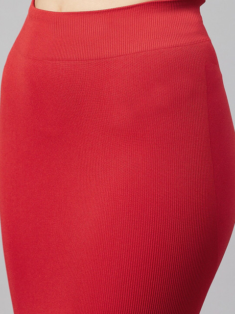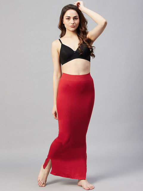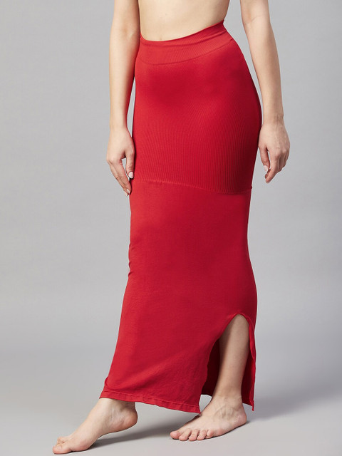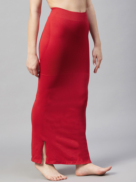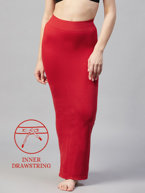 Red ribbed Seamless saree shapewear, has an elasticated waistband with drawstring closure with side slit.